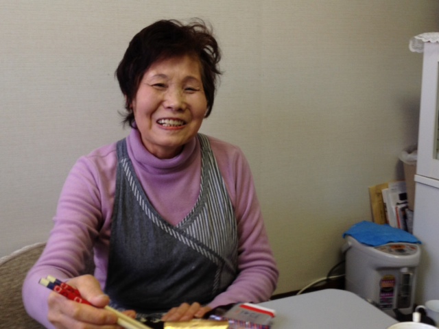 そのお茶をご馳走してくださったSさん。訪問した時は趣味の「ちぎり絵」制作の真っ最中だったのですが、作りためた作品などを見せて頂きながら、被災時のお話、その後の生活のお話、仮設でのおつきあい等について、あれこれ話してくださいました。