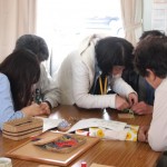 根付け作りでは、とんぼ玉やアジアンコード(ひも)の色選びを楽しんでいたり、